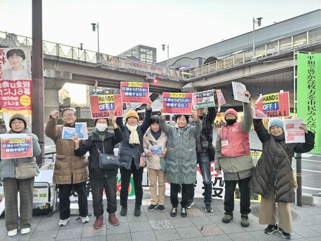 米トランプ政権による国際法無視のベネズエラ攻撃、マドゥロ大統領拉致に、世界の市民が糾弾。日本でも、高市政権の黙認を批判し、首相官邸前をはじめ都内、千葉、神奈川、滋賀、京都、大阪、兵庫など各地で、集会・デモ、スタンディング、さまざまな行動を通して市民が抗議の声を上げた。