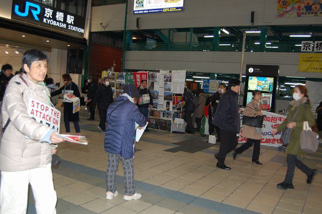 大阪の参加者らはJR・京阪京橋駅前のパレスチナ連帯街頭写真展へ。25日国際集会やカンパも訴えた。