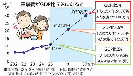安全保障では安保「3文書」を前倒しで改定し「主体的に防衛力の抜本的強化を進める」と言います。ますます軍事費が膨らんでいきそうです。軍事費を対GDP比5%とすると年間約30兆円。税収の3分の1にもなります。4人家族で年100万円の負担になります。それだけの予算を使う必要はあるのでしょうか。