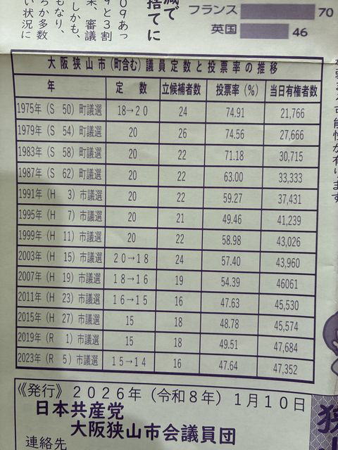 大阪狭山市でも、かつては20名だった議員定数が、現在の14名にまで削減されてきました(別表参照「狭山民報」より)。