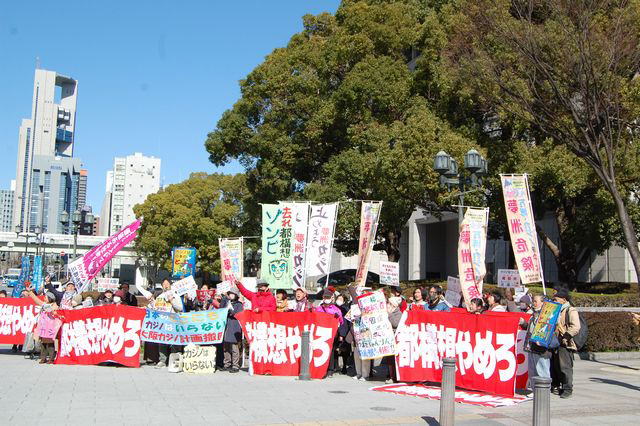 大阪府知事市長ダブル選、カジノに続き副首都構想を打ち出し、「都構想住民投票も信をえた」と強行しようとすることに対し、市会開会日の2月17日、市民が抗議の声を上げました。
