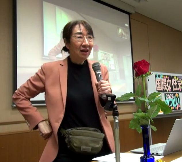 1975年アイスランドの女性たちの運動に学び、6日、「女性の休日」運動に取り組んだことも紹介し、「高市政権の戦争政策に反対し、軍需予算の削減・改憲阻止、税金はくらしに回そう」と呼びかけた。