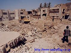 バグダッドのマンスール地区に行った。サダム・フセインが隠れているとの情報で、四月七日、ミサイルが撃ち込まれた場所だ。主要街路から一筋入った住宅地だった。着弾地では、家のがれきで穴を埋める作業が続いていた。直径二十メートル、深さは七〜八メートルはありそうな穴だ。バンカーバスターが使われたに違いない。