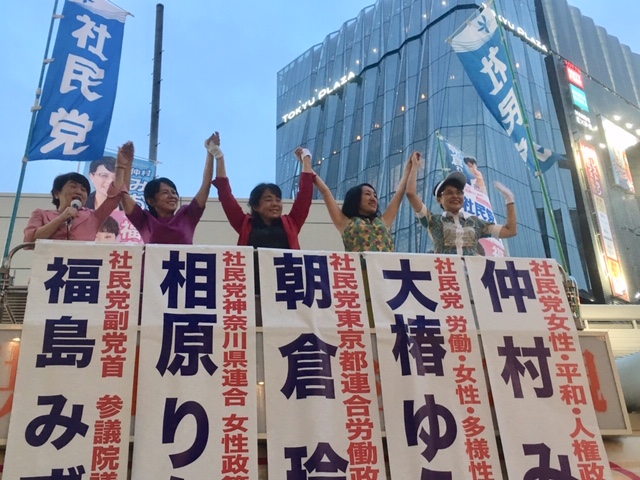 福島みずほ副党首ら社民党女性街頭宣伝で、比例代表予定候補の仲村さんは「辺野古を止める」、大椿さんは「格差のない社会に」とアピール(4・5面に関連記事)。