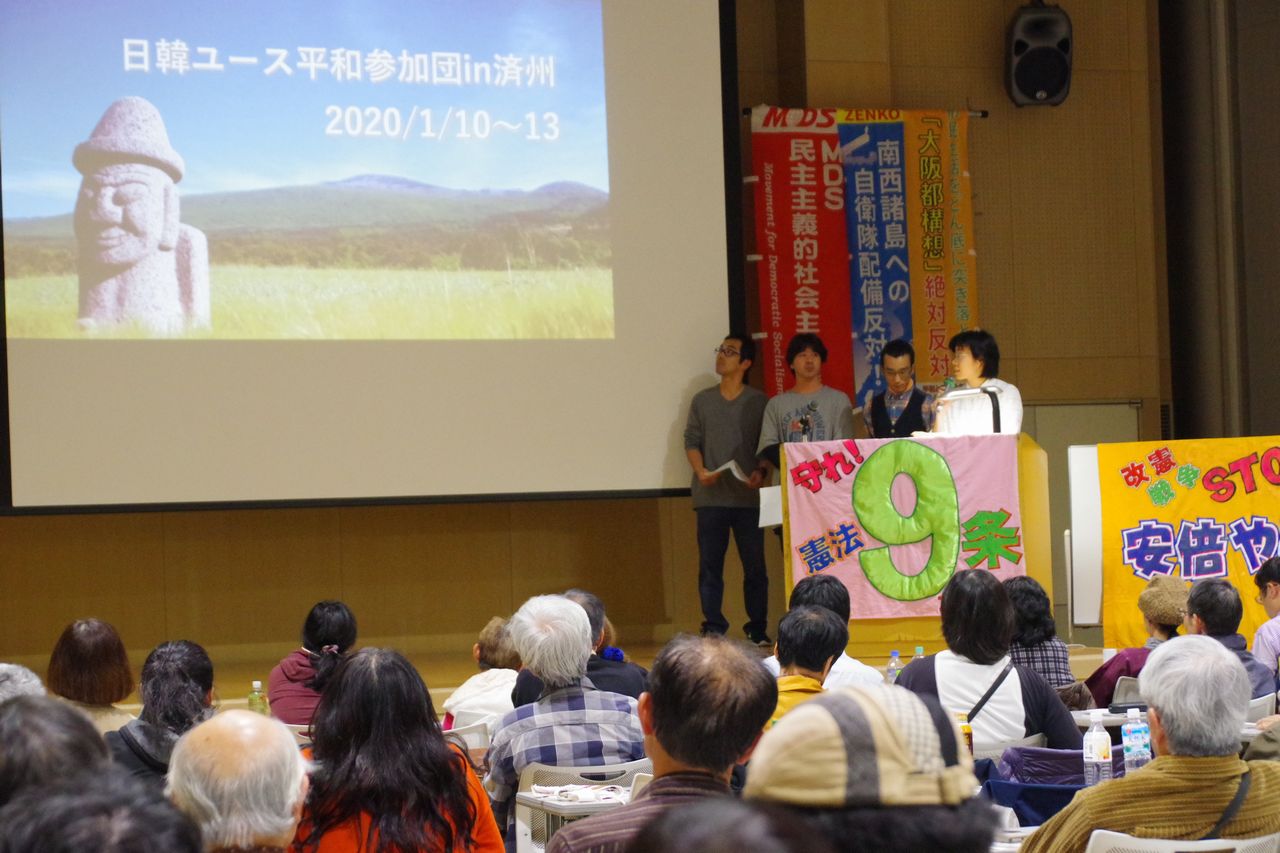 "日韓政府が険悪な状況だからこそ同世代の連帯を作りたい" と日韓連帯ユース平和参加団in済州への参加と協力が呼びかけられた(4・5面に関連記事)。