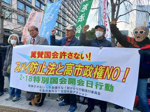 市民らが「スパイ防止法と高市政権NO」と声を上げた。